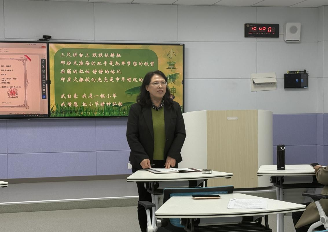 讲座伊始,张洪芹教授以“诗可以兴、可以观、可以群、可以怨”的育人功能破题,结合国家级一流课程《组织学与胚胎学》建设经验,系统阐释了“诗教”在课程思政中的独特价值。她强调,伴随“课堂革命”持续深化,教师需从“知识传播者”转变为“价值引领者”,善用诗词创设情境、借伟人警句升华情感、以专业故事承载使命,从而实现思政元素与医学知识的无声融入,引导学生在“审美-共情-思辨”的递进中筑牢专业理想与家国情怀。