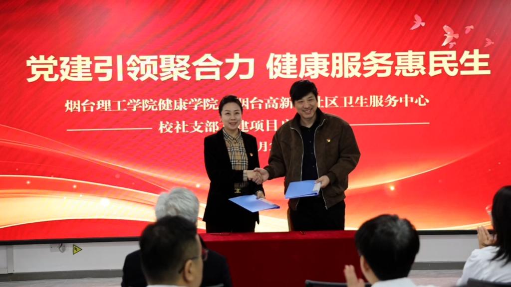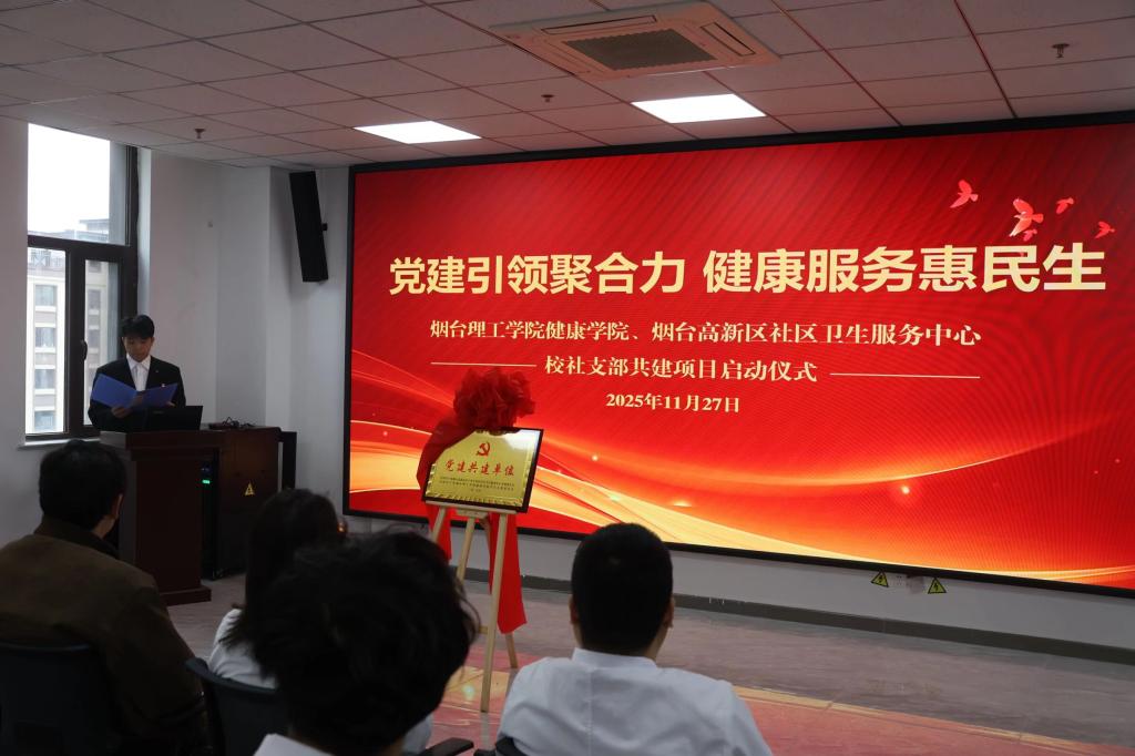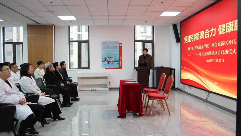 为深入学习贯彻党的二十届四中全会精神,扎实推进健康中国战略落地见效,11月27日,烟台理工学院健康学院党总支书记刘大华、团总支书记董瀚文、辅导员苏子轩一行赴烟台高新区社区卫生服务中心,参加烟台理工学院健康学院学生党支部与烟台高新区社区卫生服务中心党支部“党建引领聚合力 健康服务惠民生”校社支部共建项目启动仪式。烟台高新区社区卫生服务中心党支部书记、主任钱峰,副主任王爱景、俞军庭等领导出席仪式,双方代表、学生党员及志愿者共同参与活动。